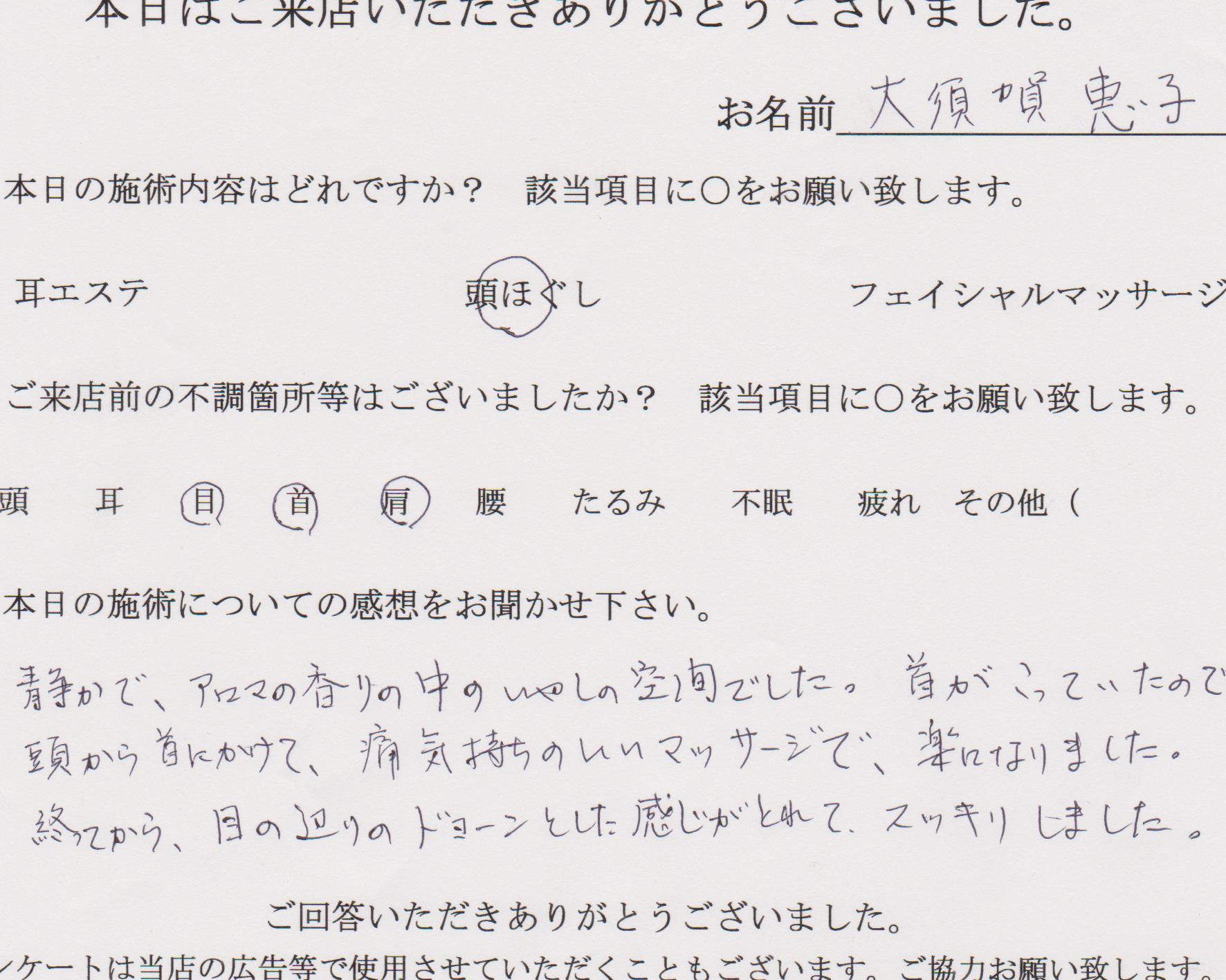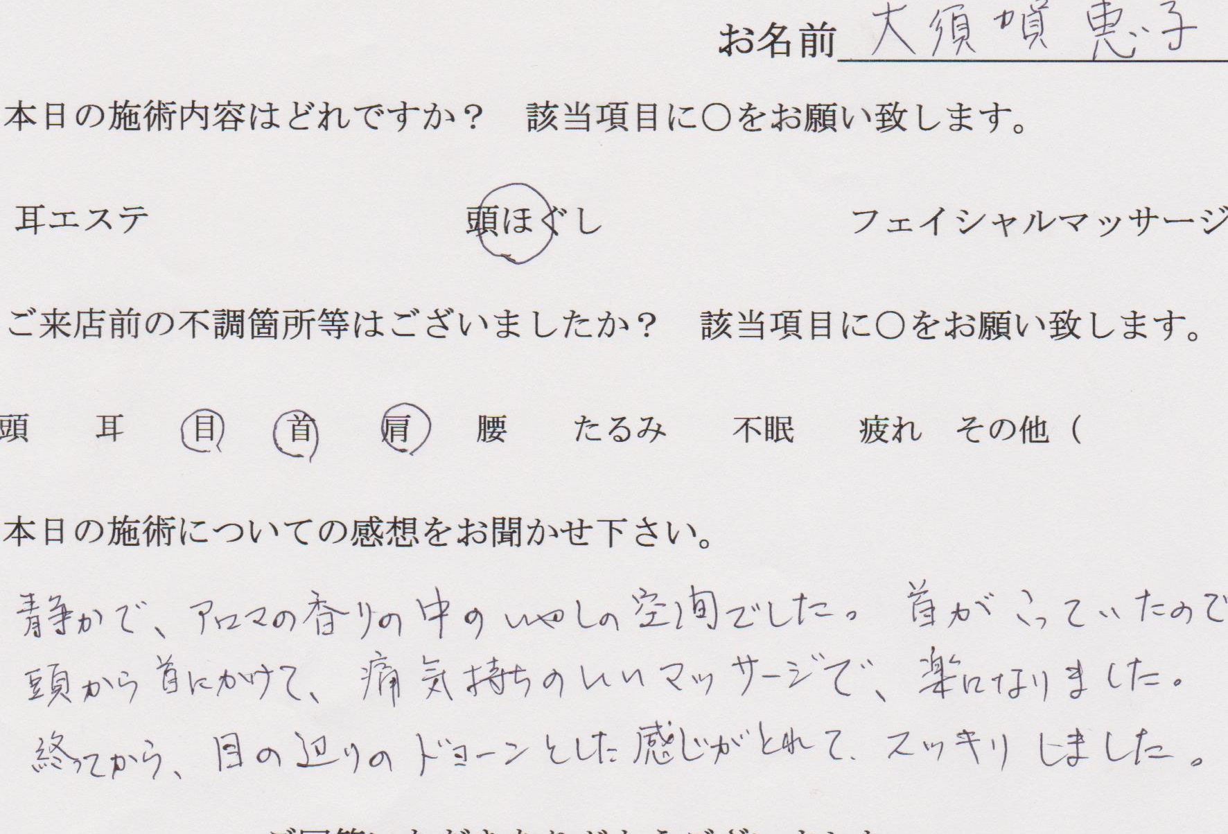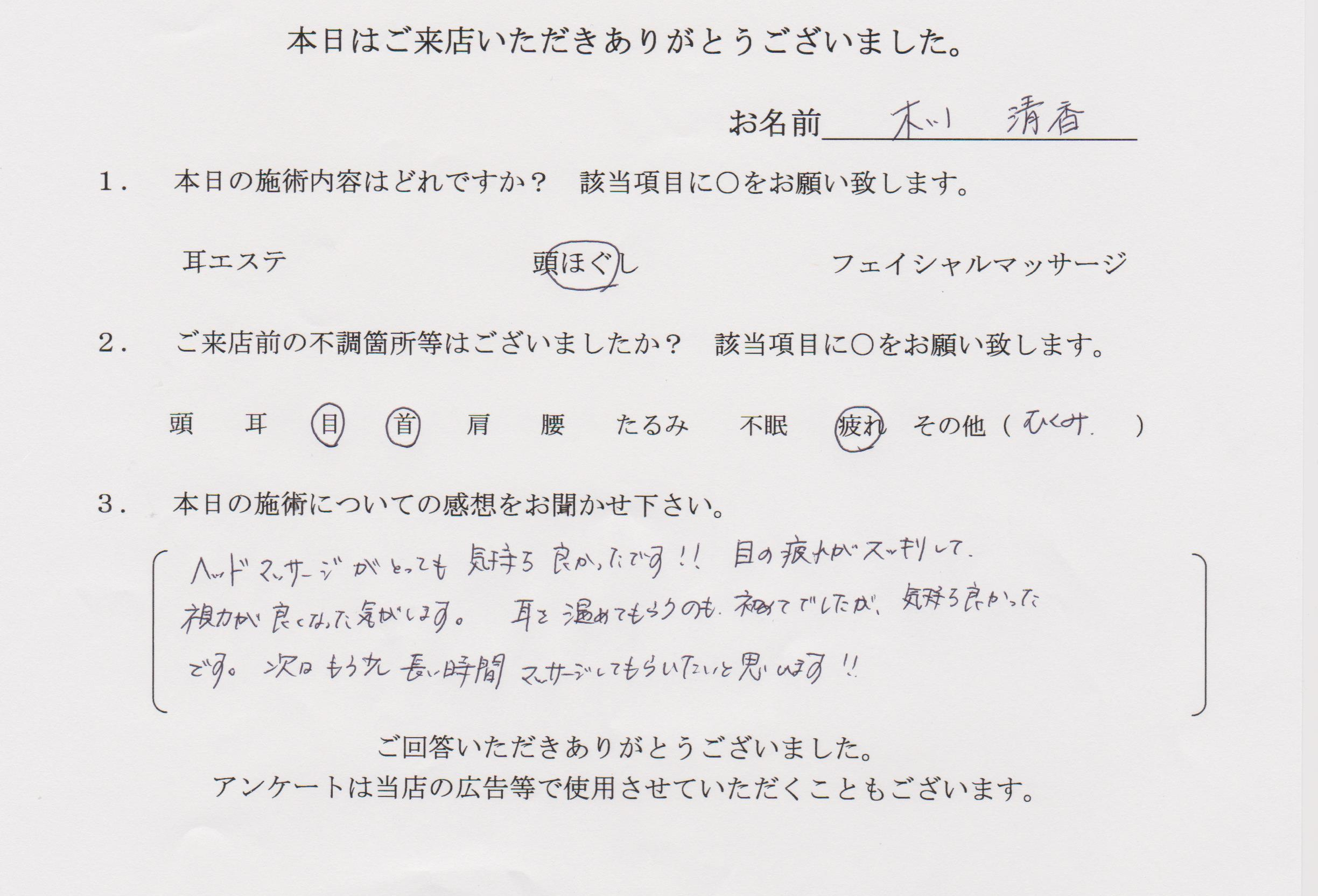 ヘッドマッサージがとっても気持ちよかったです!! 目の疲れがスッキリして視力が良くなった気がします。耳を温めてもらうのも初めてでしたが、気持ちよかったです。